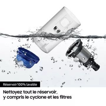 - Technologie d’aspiration : Multi-cyclonique : cette aspiration permet de traiter les grosses poussières ainsi que les particules fines grâce à ses multiples cyclones. Elle offre une force d’aspiration intense pendant toute la durée du nettoyage