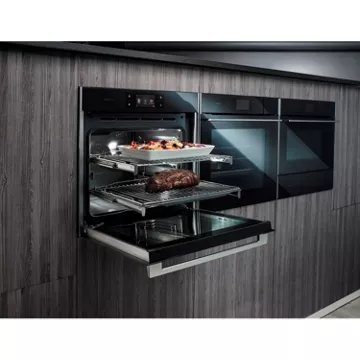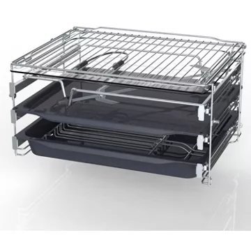 - Rails téléscopiques : ils permettent d’accéder à vos plats en les faisant coulisser en dehors de l’enceinte de cuisson en évitant les risques de basculement. Vous pourrez arroser confortablement votre rôti ou retourner facilement vos plats sans risque de brûlure.