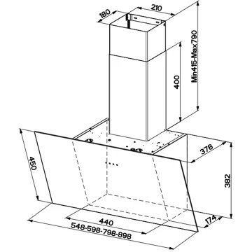 - Type de hotte : décorative murale inclinée, combine style et fonctionnalité. Sa conception permet de mieux gérer l’espace au-dessus de la zone de cuisson. Elle évite de devenir un obstacle dans l’espace de cuisson et n’obstrue pas la vue, rendant plus facile la préparation des plats.