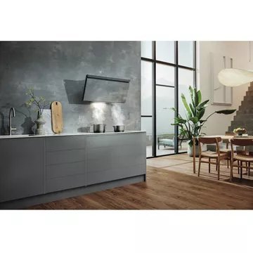 - Type de hotte : décorative murale inclinée, combine style et fonctionnalité. Sa conception permet de mieux gérer l’espace au-dessus de la zone de cuisson. Elle évite de devenir un obstacle dans l’espace de cuisson et n’obstrue pas la vue, rendant plus facile la préparation des plats.