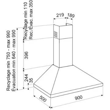 - Largeur : 90 cm, pour une zone de cuisson allant jusqu’à 90 cm de largueur.