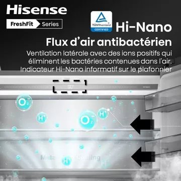 - Froid du réfrigérateur : le froid ventilé permet une répartition du froid de manière homogène et un rangement libre, sans contrainte, des aliments dans le réfrigérateur