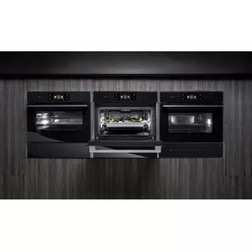 Design soigné : façade noire, verre, acier inox, ce qui le rend esthétique et compatible avec des cuisines modernes.